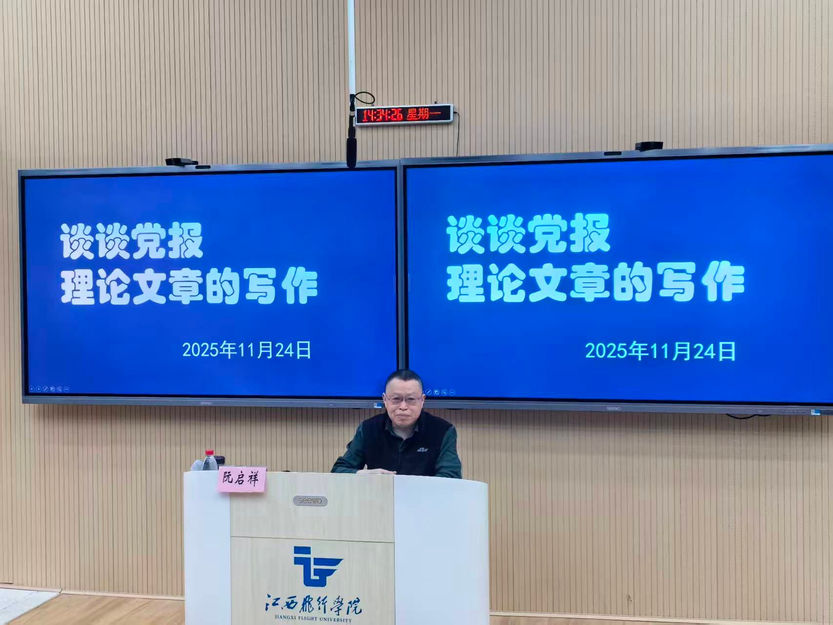 2025年11月24日,江西飞行学院在卧龙报告厅举办“党报理论文章的写作”讲座,江西日报理论评论部原主任阮启祥作专题辅导。讲座由党委宣传部、科研处主办,低空经济发展研究院、低空经济研究基地、赣商文化研究基地承办。