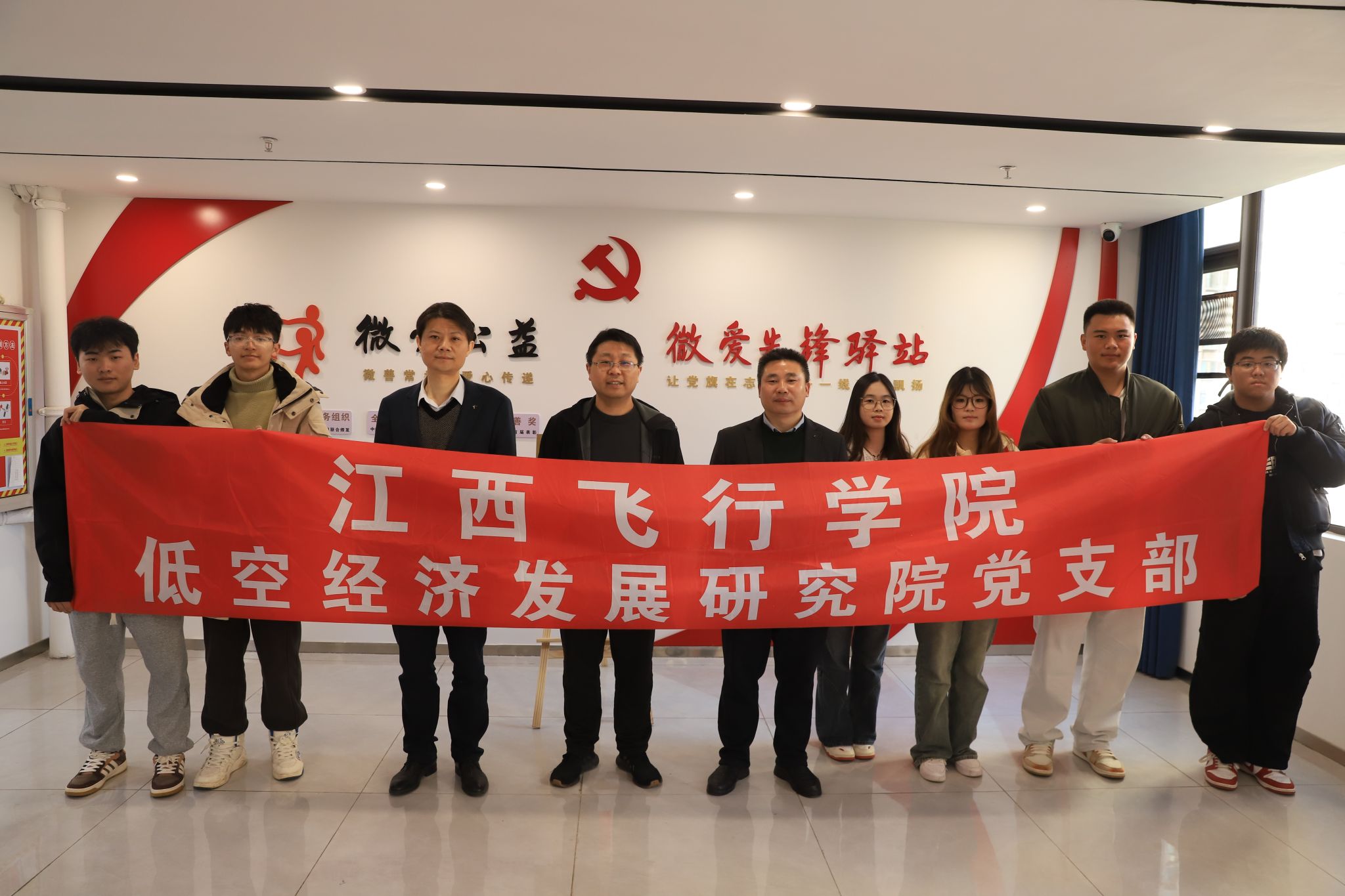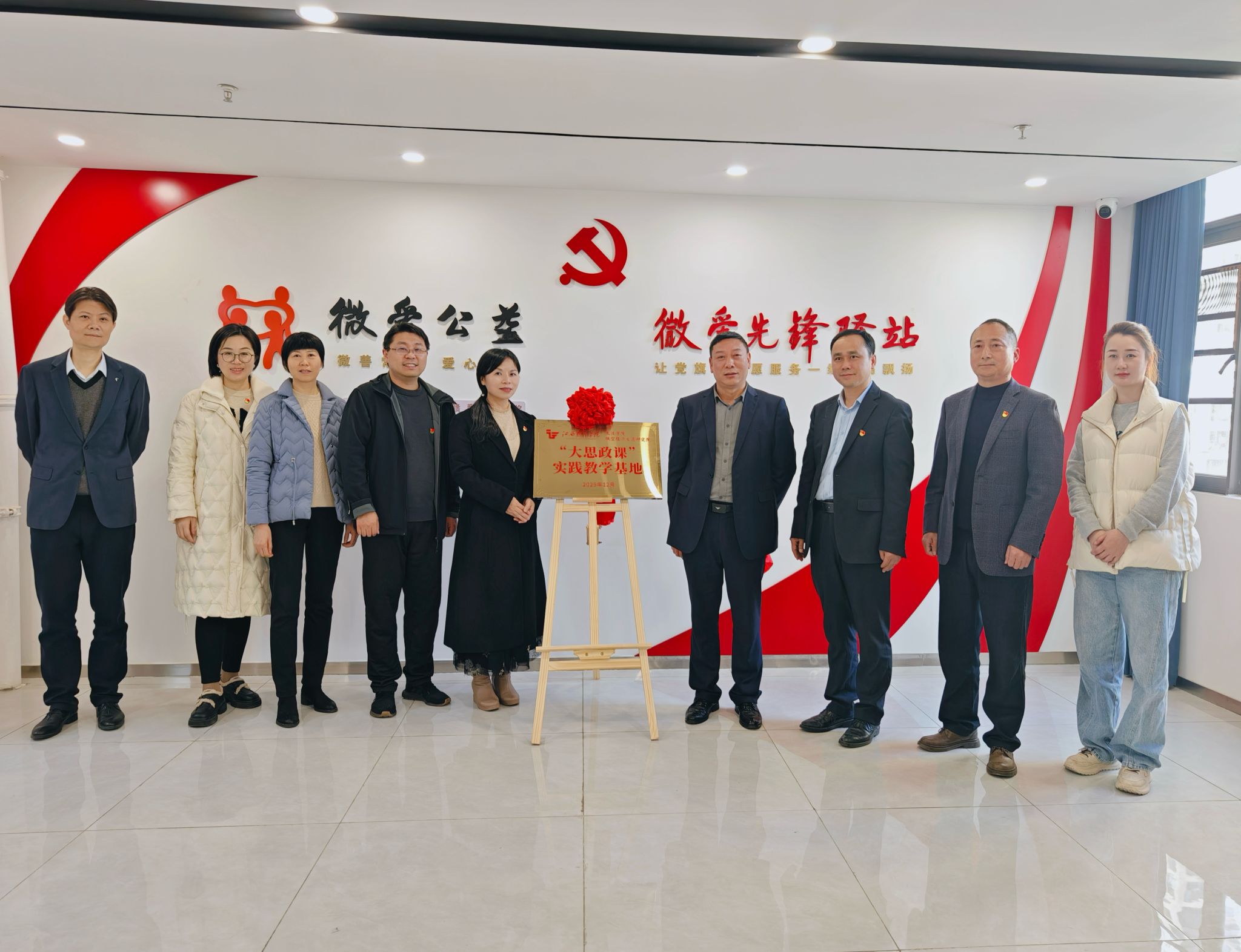 为深化实践育人成效,推动党建工作与专业教育融合发展,12月17日下午,低空经济发展研究院党支部联合文法学院、科研处、资产管理处等单位,组织教工党员、学生党员代表以及赣文化交流协会、青年普法协会、红色故事英语宣讲队和红色班级成员,前往南昌县微爱公益志愿者协会开展实践教育交流活动,并举行“大思政课”实践教育基地揭牌仪式。